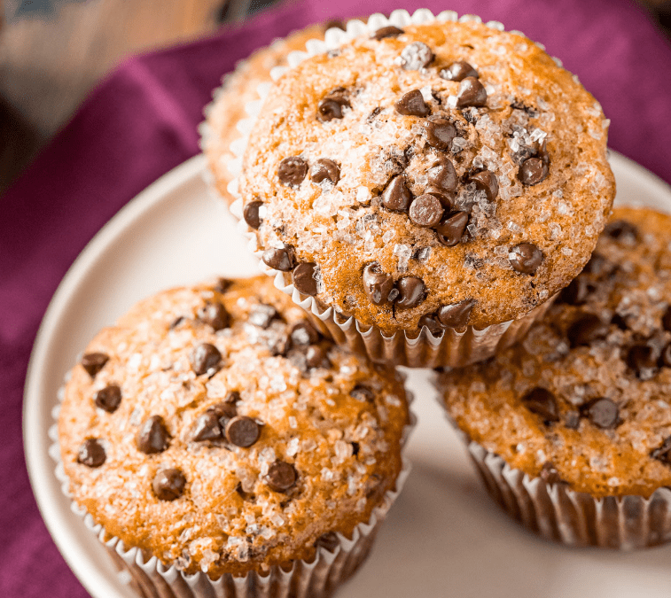 Divide batter evenly between each muffin liner and top with additional mini chocolate chips and coarse sugar, if desired.