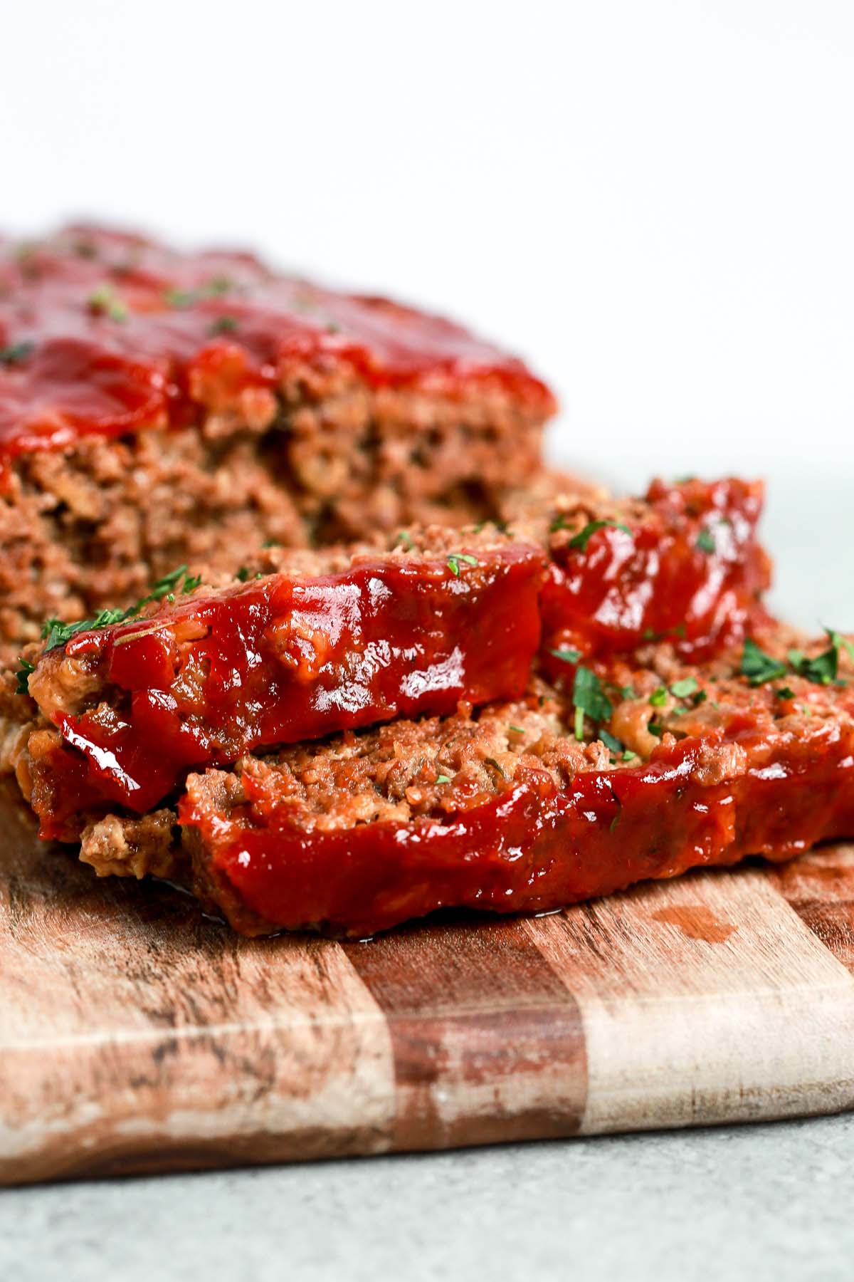 Mix all ingredients except ketchup by hand until well blended. Divide in half and shape into 2 loaves about 8″x4″x3″. Place ketchup on top of each loaf, if desired, and bake on greased rack of roasting pan at 350° about 75 minutes. Makes 8-12 servings.