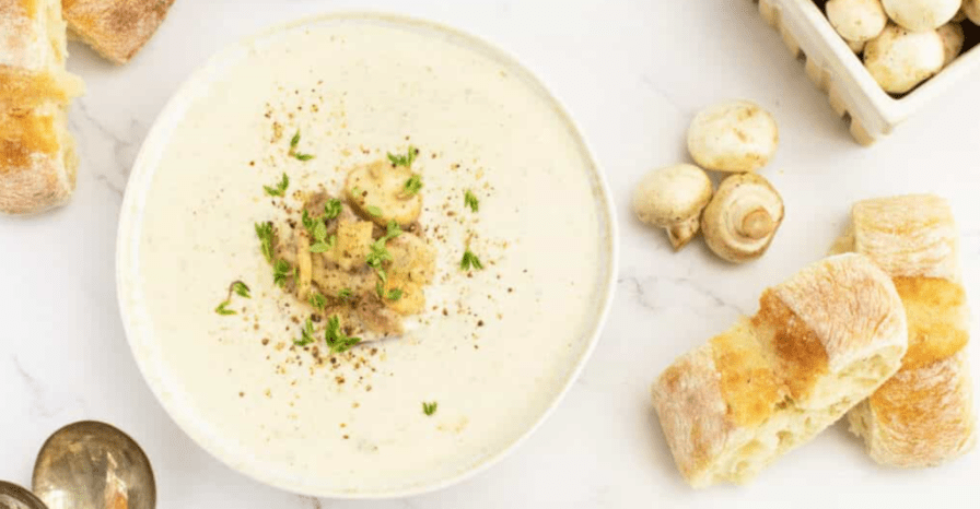 - Ladle into bowls, and garnish with reserved mushroom slices and fresh parsley or thyme leaves.